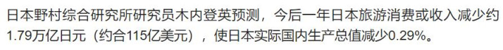 日本的数据机构估算,光是今年一年,旅游业直接损失预计达到1.79万亿日元,相当于GDP缩水0.2个百分点。